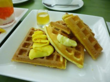 ワッフルには密とマンゴームースをたっぷりつけて食べます♪