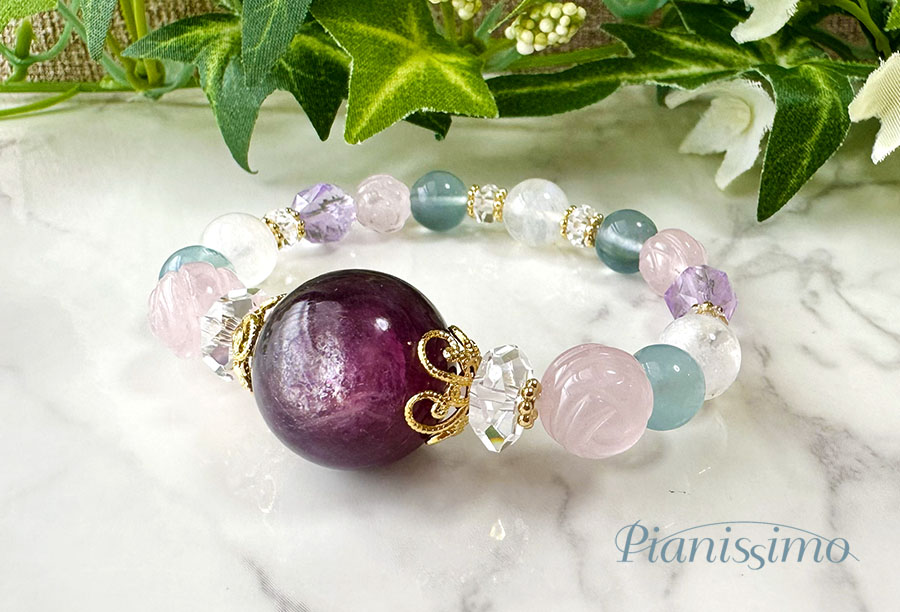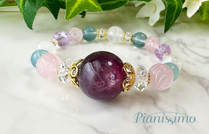 大粒のパープルマイカをトップに合置いて、ご依頼頂いた内容を考慮し、ローズクォーツ、グリーンフローライト、ラベンダーアメジスト、レインボームーンストーン、水晶を組み合わせていきました♪