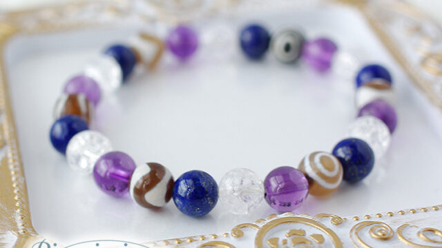 魔よけの虎牙天珠、人間関係を良くして良縁を引き寄せる二眼天珠と、魔除け・仕事運アップのアメジスト、直感を高めて運気を守るラピスラズリ、浄化を促して他の石のパワーを高めるクラック水晶を組み合わせました。