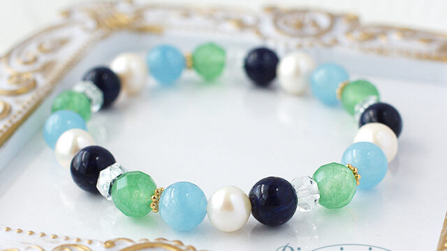こちらは、第五チャクラを活性してコミュニケーションを高めるアクアマリン、ハートチャクラを活性して心の安定と愛を引き寄せるグリーンアベンチュリン、第六チャクラを活性して直観力を高め、正しい道へと導いてくれるインペリアルソーダライト、愛情運を高め、本来持っている魅力を開花させてくれる淡水パール、浄化を促して、他の石のパワーも増幅してくれる水晶を組み合わせたブレスレットです。