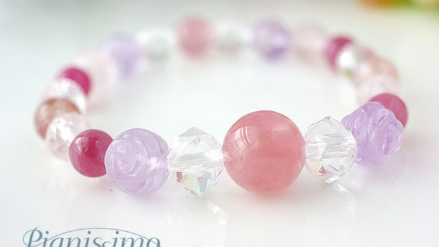 こちらは、トップにディープローズクォーツを置いて、そしてスターカットを施した水晶、薔薇カットのラベンダーアメジスト、ピンクトルマリン、レッドルチルを組み合わせたブレスレットです。