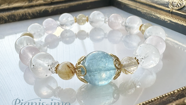 こちらは、トップに透明なアクアマリンを置いて、ゴールドルチル、パイライト・イン・クォーツ、キラキラのカット水晶を合わせたブレスレットです。